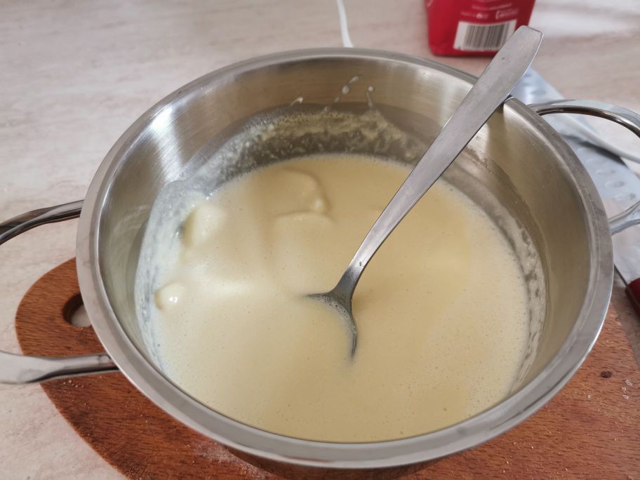Haal van het vuur en voeg de goed uitgeknepen gelatine toe. Roer en voeg geleidelijk de witte chocolade toe. Meng goed en laat afkoelen tot kamertemperatuur gedurende ongeveer 30 minuten
