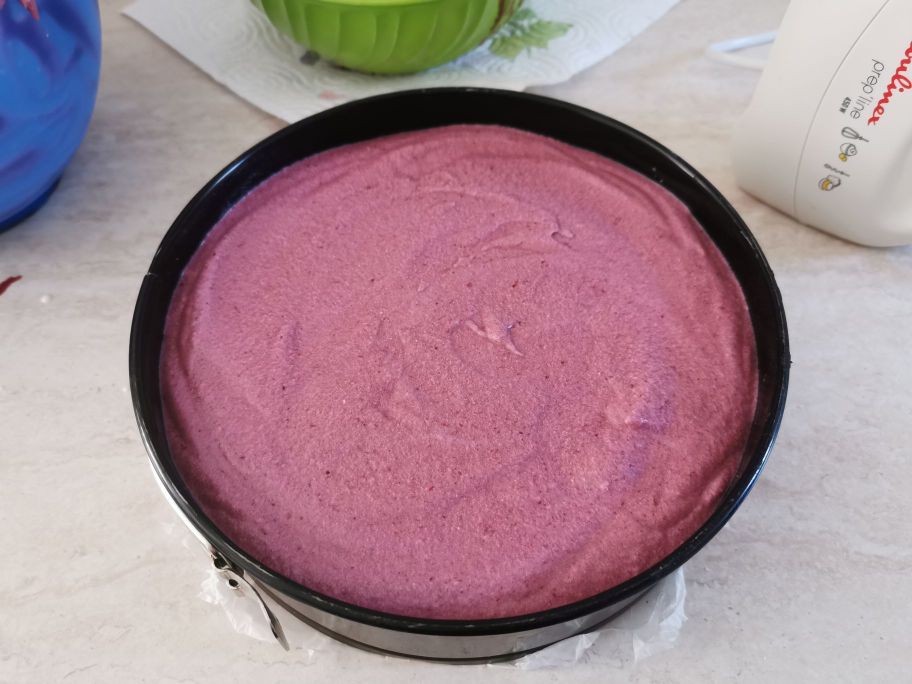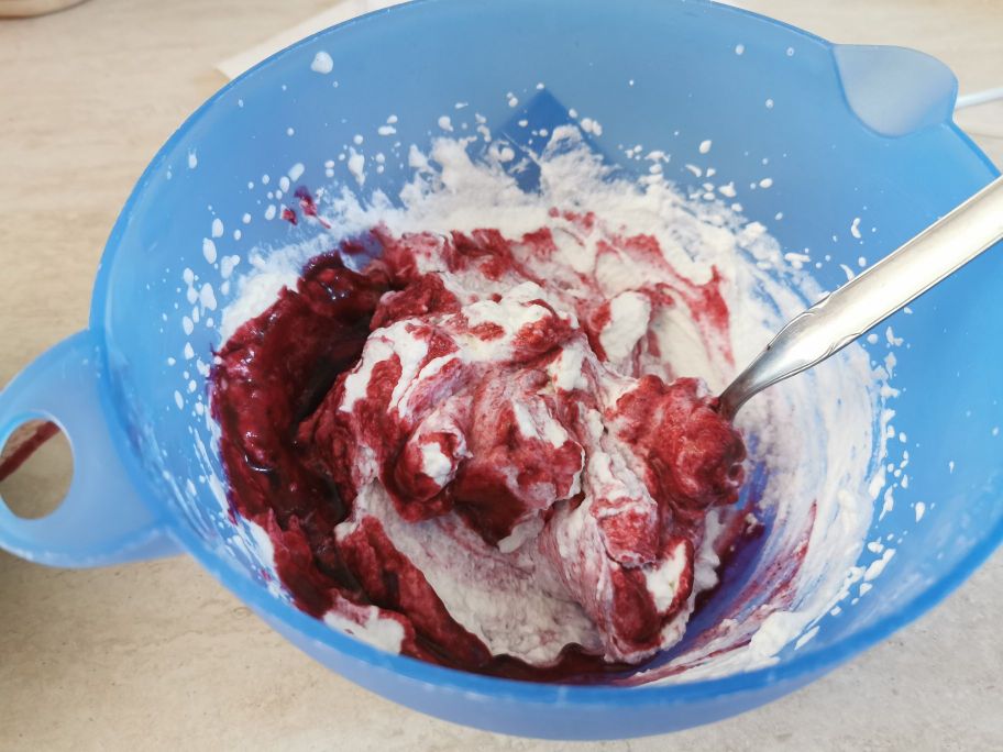 Klop de slagroom, voeg geleidelijk de bosvruchtencoulis toe, roer met een spatel om gelijkmatig te mengen.