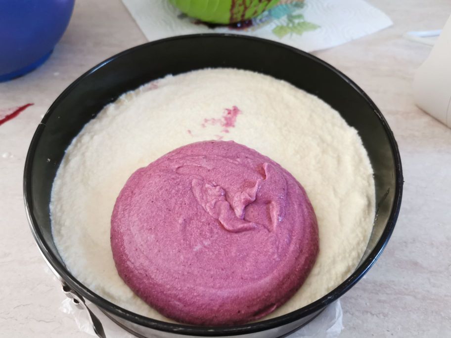 Giet de mousse met bosvruchten over de witte chocolademousse, strijk het oppervlak glad. Zet in de koelkast gedurende 3 uur of in de vriezer gedurende een half uur.