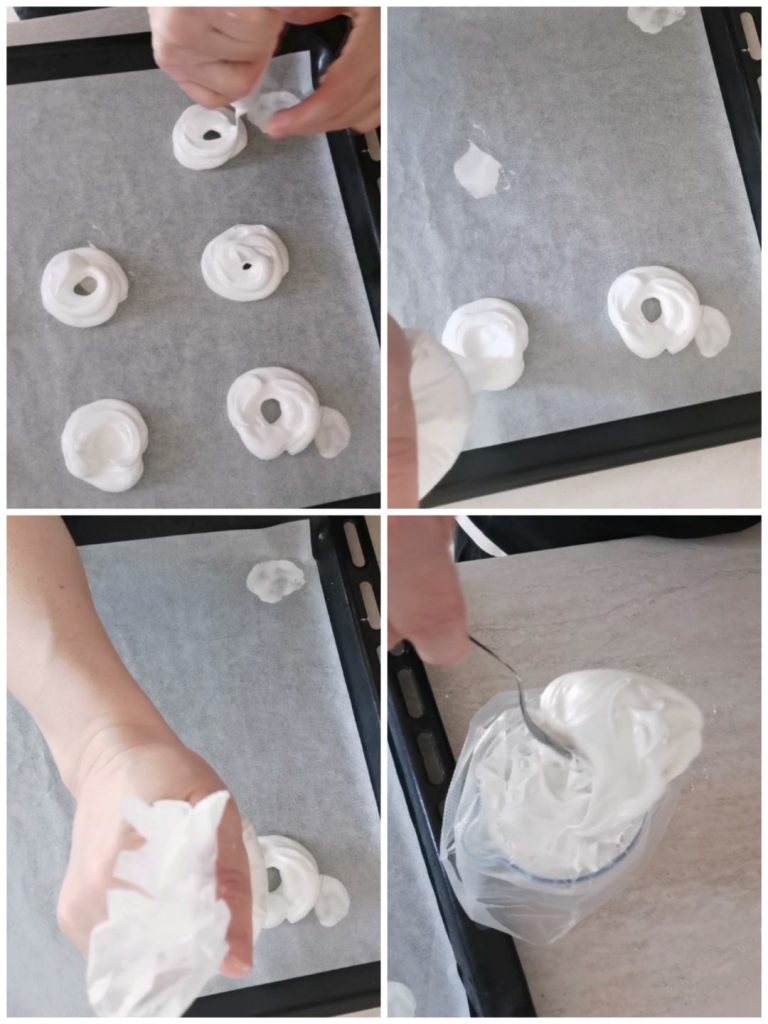• We gieten de meringue in een spuitzak (als je geïnteresseerd bent om er een te kopen, klik hier), uitgerust met een gekartelde spuitmond. Teken cirkeltjes van ongeveer 8 cm in diameter op de achterkant van het bakpapier, deze zullen dienen als maat voor de nesten. Begin met het vormen van een spiraal en draai dan de randen met 2 of 3 rondjes. Bestrooi de meringues met gekleurde suikerparels. Bak gedurende ongeveer 1 uur en 30 minuten op 100°. Laat na het bakken de meringues afkoelen in de oven met de deur op een kier