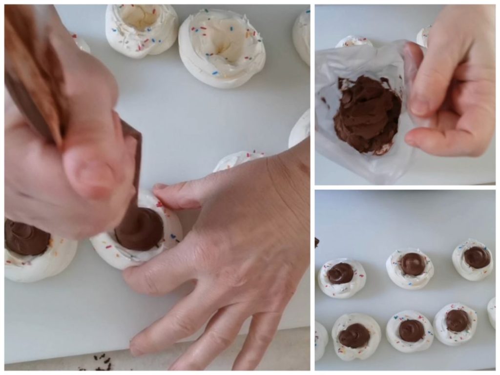 • Als alles klaar is, monteren we het. We plaatsen de cacaobotercrème in een spuitzak en vullen de nesten