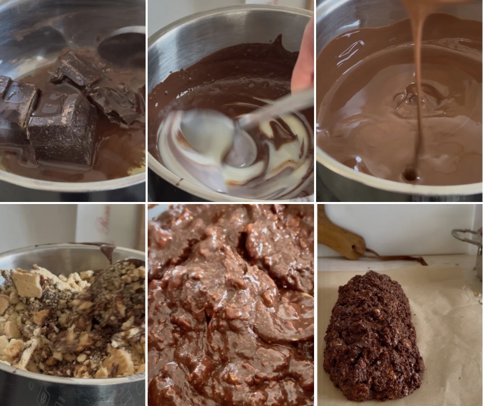 • Giet in een steelpan de gecondenseerde melk, de eerder gesmolten chocolade en de boter. Verwarm op laag vuur en roer totdat de ingrediënten goed gemengd zijn, voeg vervolgens de grof verkruimelde koekjes toe. Leg het mengsel op bakpapier en vorm er met behulp van het papier een salami van, wikkel het goed in en laat minimaal 2 uur rusten in de koelkast.