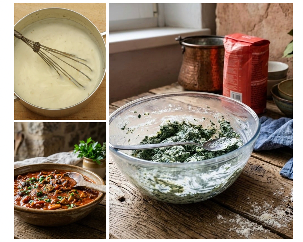 • Maak de vulling klaar: Kook de spinazie (of snijbiet), knijp goed uit en hak fijn. Meng in een kom de ricotta, mascarpone, geraspte kaas en de fijngehakte spinazie. Breng op smaak met zout en peper. Het mengsel moet romig en goed gemengd zijn.