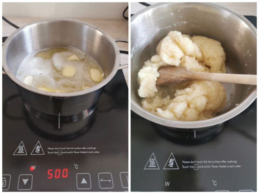 De pasta choux bestaat uit water, boter, bloem en eieren. Het water en de boter worden aan de kook gebracht, vervolgens wordt de bloem in één keer toegevoegd. Blijf roeren tot het deeg loskomt van de zijkanten van de pan. Laat het vervolgens enkele minuten afkoelen en voeg dan de eieren één voor één toe, goed roerend na elke toevoeging.