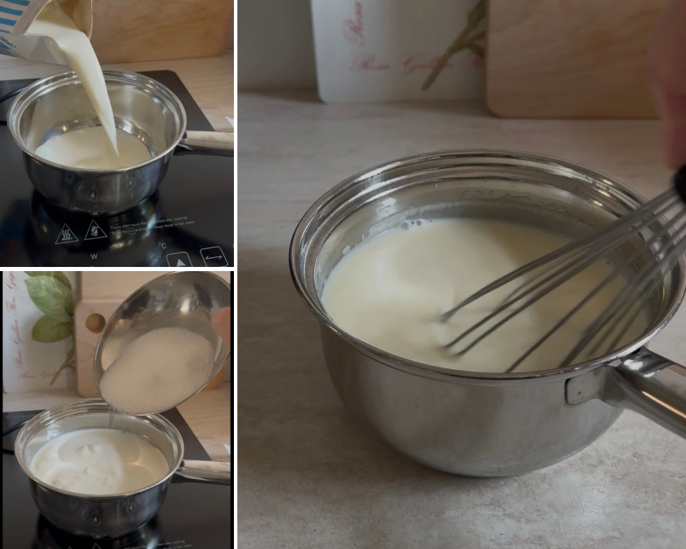 Begin met het weken van de gelatine in een kom met 6/7 eetlepels koud water. Doe de room, de melk, de suiker en de vanille in een steelpan. Verwarm op laag vuur, voortdurend roerend met een garde, totdat de suiker is opgelost.