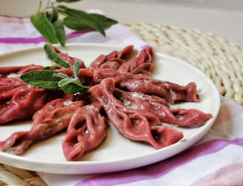 Piacentijnse tortelli met bieten: tussen traditie en kleur, een gerecht dat nooit ontbreekt op de Piacentijnse tafel. Een recept dat behoort tot de oudste traditie, dateert uit 1351, uitgevonden door de koks van het kasteel van Vigolzone, ter ere van Francesco Petrarca. Sindsdien worden ze van generatie op generatie doorgegeven, ik heb al het recept van de Traditionele Tortelli gepost, nu stel ik jullie een uitstekende alternatieve versie voor, altijd met respect voor de traditionele ingrediënten. We bereiden het deeg door de bieten toe te voegen, die kleur en een bijzondere smaak geven, en de vulling zal nog steeds van ricotta, kruiden, tijm, honing, grana padano en geraspte citroenschil zijn. De traditionele saus, boter en salie, maar met de toevoeging van tijm en citroenschil. Ze zijn echt fantastisch, geurig en licht. Probeer ze!