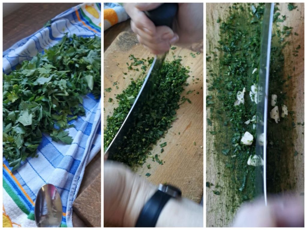 Was, laat uitlekken en droog door voorzichtig tussen 2 doeken te deppen, een mooie bos peterselie. Pluk de blaadjes en hak ze fijn met het halvemaansmes, op een snijplank, samen met 1 of 2 gepelde teentjes knoflook.