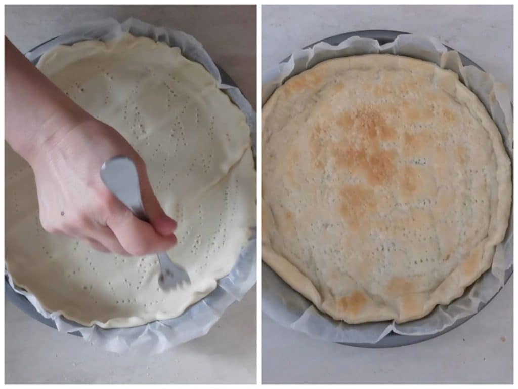 Verwarm de oven voor op 180°. Boter een ronde taartvorm van 22 cm lichtjes in. Rol het bladerdeeg uit en druk het lichtjes aan op de bodem en randen, vouw het overtollige deeg naar binnen. Prik met een vork gaatjes in de bodem om te voorkomen dat deze omhoog komt, bak het deeg gedurende 15 minuten tot het krokant en goudbruin is. Haal het uit de oven en laat afkoelen.