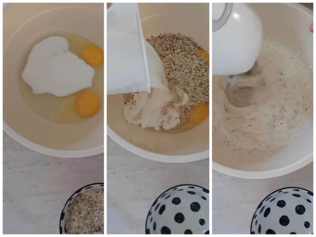 Bereid de vulling. Doe de eieren in een kom, samen met de suiker, gehakte amandelen en room. Klop krachtig met een elektrische mixer of handmatig als je dat liever hebt, tot je een homogeen en klontvrij mengsel krijgt.