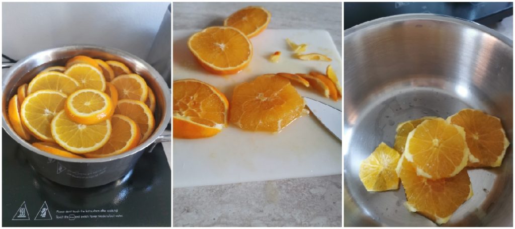 Marmelade maken. Was en snijd de citrusvruchten in plakjes, leg ze in een pan met koud water. Breng aan de kook en zodra het kookt, giet je het water af; herhaal deze handeling 2 keer. Verwijder de schil van bijna alle plakjes behalve die welke je als decoratie gebruikt (4 of 5 plakjes).