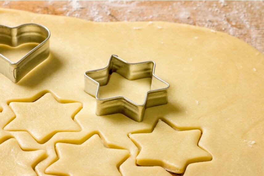 Rol het deeg uit tot een dikte van 5 mm en steek de koekjes uit met een koekjessnijder, in dit geval in de vorm van een ster, een scherpe snede, haal het er voorzichtig af en leg het op een bakplaat bekleed met bakpapier. Leg de koekjes op een afstand van een halve cm. Zet ze 20 minuten in de koelkast. Bak ze in een voorverwarmde oven op 180°C gedurende 12 minuten, tot ze licht goudbruin zijn. Haal ze uit de oven en laat ze afkoelen zonder ze te bewegen, om ze niet te vervormen. Nu kun je ze versieren met de koninklijke icing