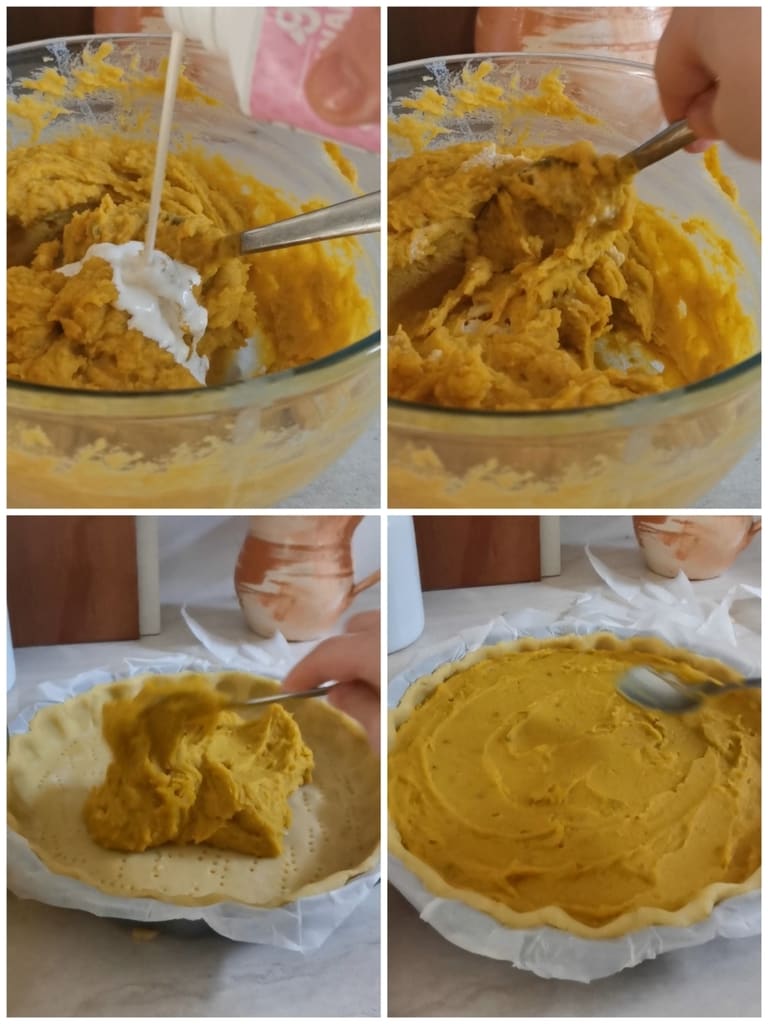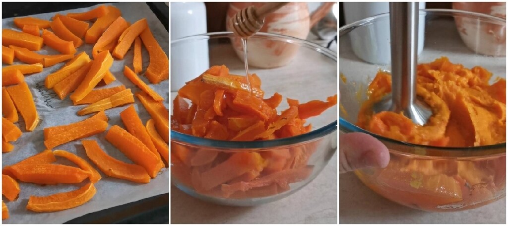 We beginnen met het bakken van de pompoen in de oven gedurende ongeveer 20 minuten op 160°. Zodra het klaar is, doe je de pompoen in een kom en pureer je het met een aardappelstamper tot een puree. Voeg het ei, de suiker, de honing, de kaneel en het zout toe en mix het geheel met een staafmixer tot een gladde massa.