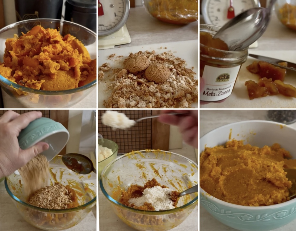 We maken de vulling: Plet de pompoen met een aardappelstamper en haal alle droge puree eruit. Als je een gele pompoen gebruikt, is deze wateriger en moet je hem uitwringen met een theedoek. Doe in een kom en voeg de fijngehakte amaretti, de kaas, de fijngehakte mosterd, de nootmuskaat en het zout toe. Meng goed en voeg het ei toe, de hoeveelheid varieert afhankelijk van de zachtheid van het mengsel, dat niet te vloeibaar maar romig moet zijn. Zet apart en laat minstens 15 minuten rusten. (Het originele recept vereist dat de vulling minstens 12 uur in de koelkast wordt bewaard, zodat het goed kan mengen. Als je tijd hebt, kun je het een dag van tevoren bereiden)