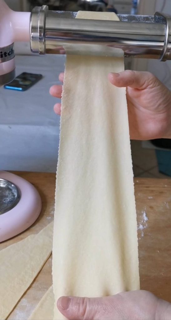• Plaats alle ingrediënten in de kom van de mixer en meng met de K-klopper gedurende ongeveer 2 minuten op lage snelheid. Verwijder de K-klopper en plaats de deeghaak, zet de mixer weer aan en kneed gedurende 5 minuten. Je moet een compacte, zachte en niet plakkerige massa krijgen. Zet de machine uit, haal het deeg uit de kom en vorm een bal, wikkel deze in de doek en laat 30 minuten rusten. Na de rusttijd verdeel je het deeg in 4 delen, plaats je de deegrolleraccessoire in de machine, neem een stukje deeg, plat het uit met de deegroller en plaats het dan in de pastamachine met de grootste dikte. Ga door met het verkleinen van de dikte van de pastamachine tot je een uiterst dun deeg verkrijgt.