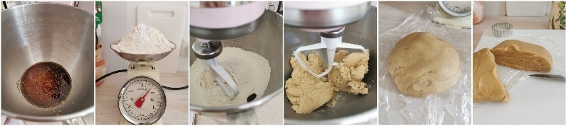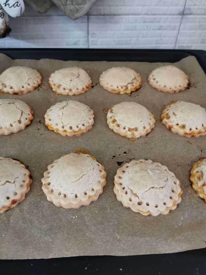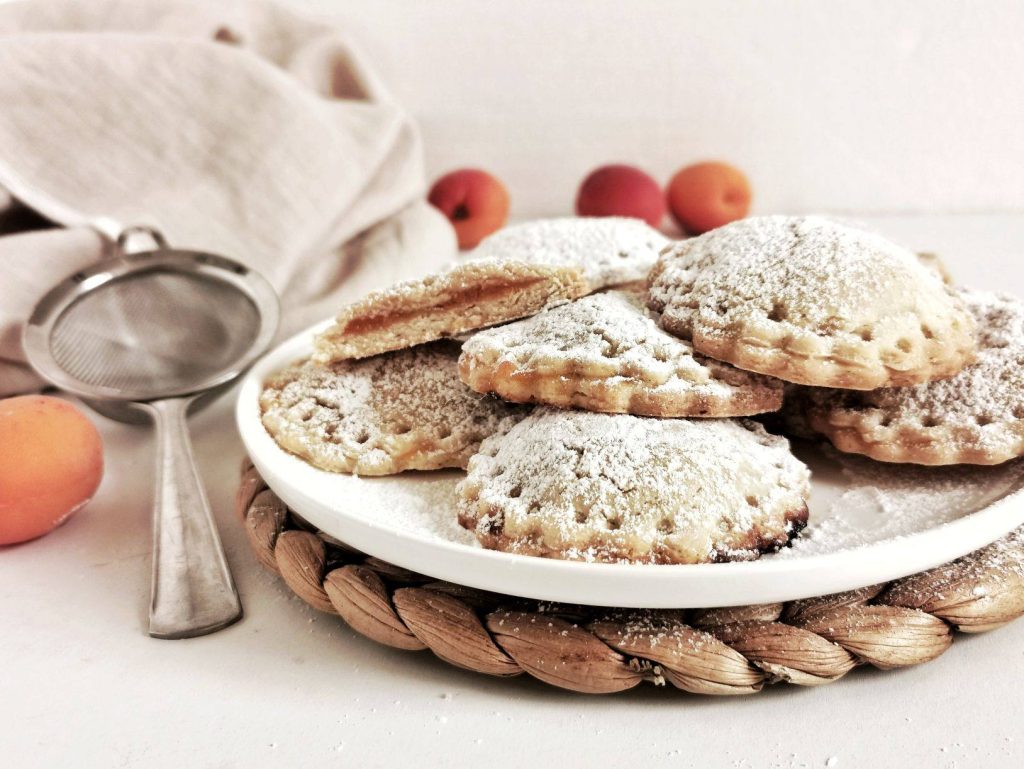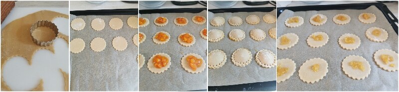• Rol het deeg uit met de deegroller tot een dikte van ongeveer 3/4 mm op een licht met bloem bestoven werkvlak. Gebruik een ronde uitsteker van ongeveer 8 cm in diameter of een getande uitsteker om schijven uit te snijden. Vul de helft van de schijven door in het midden van elk wat jam en een theelepel abrikozen te leggen, bedek ze dan met de resterende schijven en druk de randen goed dicht, eerst met je vingers en vervolgens met een lange houten spies, waardoor kleine gaatjes ontstaan.