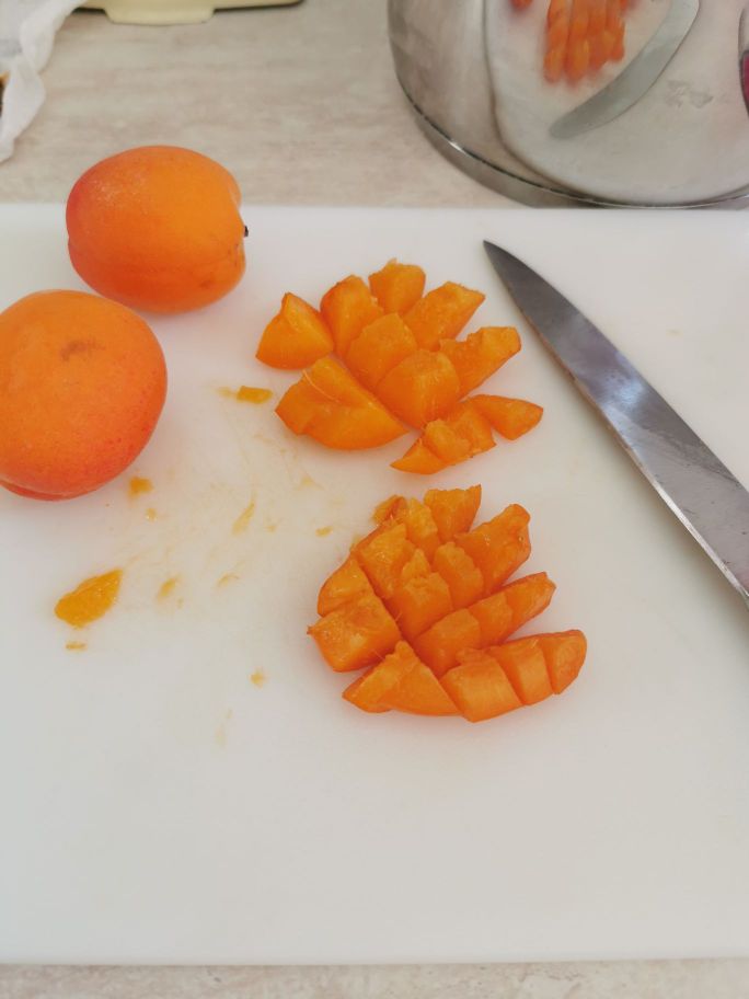 • Was en snijd de abrikozen in stukjes, meng ze dan in een pan met bruine suiker en een beetje citroensap. Zet op het vuur en kook ongeveer 10 minuten.