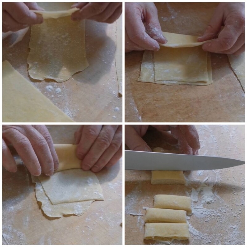 We maken onze pappardelle / tagliatelle met de hand. Neem de laag en vouw deze op zichzelf, zonder te pletten, zoals op de foto, en maak er een rechthoek van. Snijd het diagonaal, in stroken van ongeveer 10 mm breed voor de tagliatelle, of iets breder als je pappardelle wilt maken.