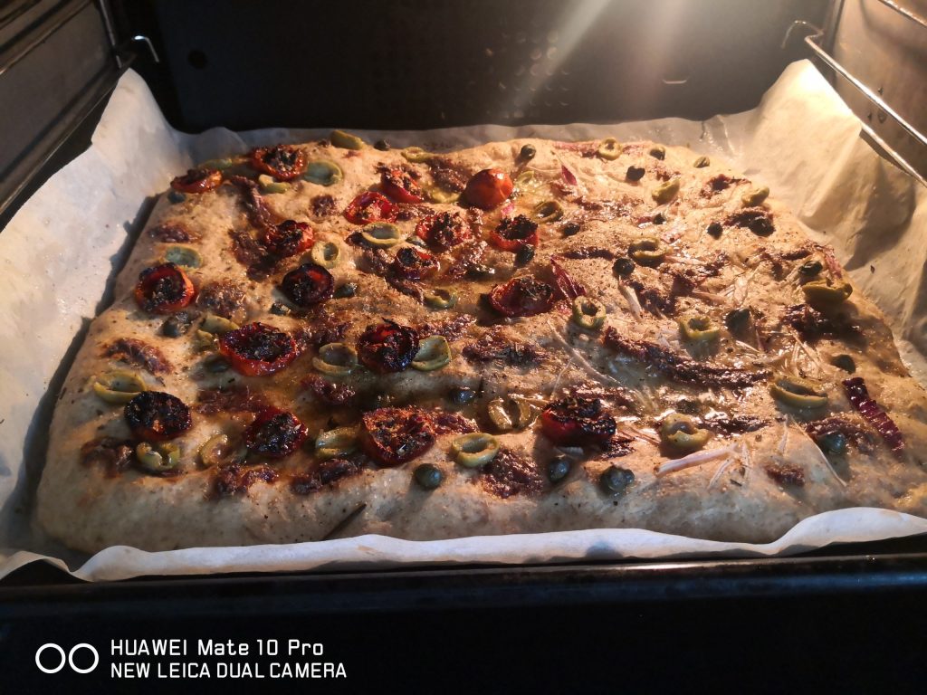 Begin vervolgens de focaccia te vullen, ik heb over het gehele oppervlak kappertjes, olijven en ansjovis gelegd, vervolgens heb ik op de ene helft fijn gesneden Tropea ui en op de andere helft de gekonfijte kersentomaatjes, zout, peper en extra vergine olijfolie aangebracht. Tot slot een beetje water op het oppervlak sprayen.