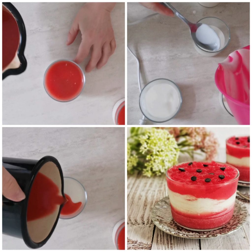 • Neem 3 glazen potten en doe een beetje watermeloenmengsel in elk, we maken 3 lagen, rood, wit, rood. Haal de room uit de vriezer en giet het over het watermeloenmengsel, eindig met de watermeloen. Bewaar minstens 1 uur in de koelkast, tot het gestold is. Vlak voor het serveren verdelen we de chocoladedruppels over het oppervlak van de potten, om de zaden van de watermeloen na te bootsen. Let op, het dessert moet heel koud zijn