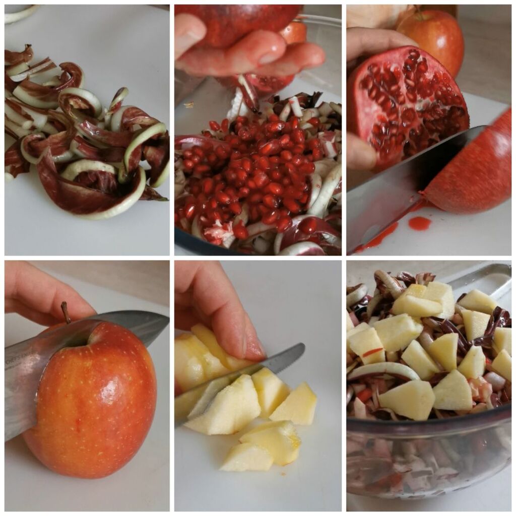 We beginnen met het wassen en snijden van de radicchio in stukken, houd de bladeren iets langer dan de rest. Neem dan de granaatappel, snijd hem doormidden, haal de zaadjes eruit. Ga verder met de appel, schil hem en snijd in stukjes. In een kom mengen we de radicchio, granaatappel, appel, walnoten en zetten opzij.