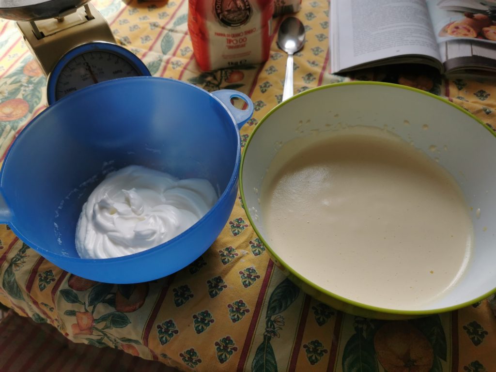 Breek twee eieren, scheid de dooiers van de eiwitten. Zet de eiwitten apart, doe de twee dooiers in een grote kom, voeg de andere twee hele eieren toe, met 100 g suiker, en mix met de elektrische garde gedurende minstens 15 minuten, tot je een luchtig mengsel krijgt. Klop de eiwitten stijf met een eetlepel suiker, voeg ze toe aan het eimengsel, en zeef er tenslotte de bloem doorheen, zodat je een zacht en luchtig deeg krijgt (biscuitdeeg).