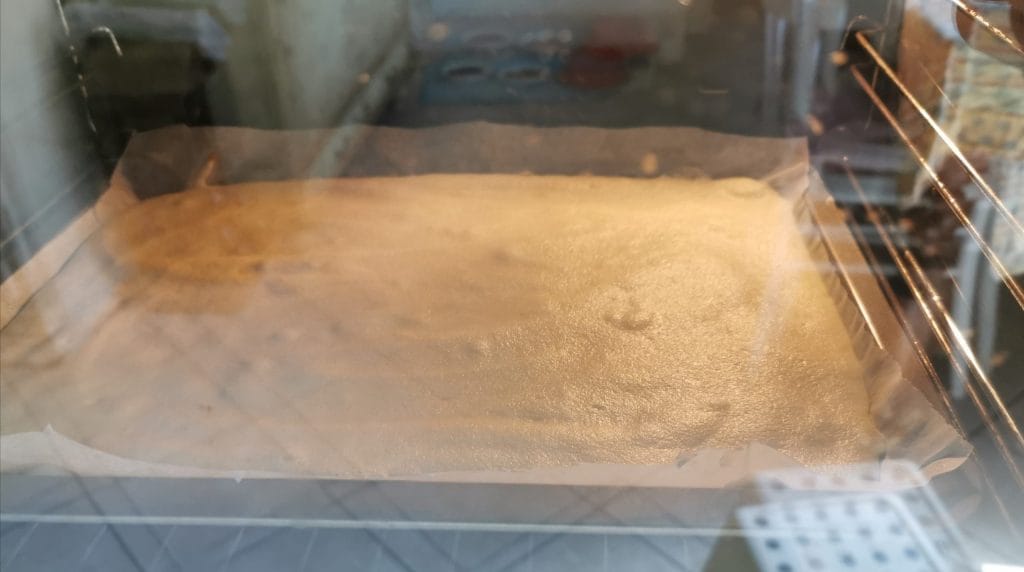 Bekleed een bakplaat van ongeveer 30×40 cm met bakpapier, vet het papier in, giet het biscuitdeeg erop, en strijk het glad met een spatel om een laag van 1 cm dik te vormen. Bak in de oven op 200° gedurende ongeveer 12/13 minuten.
