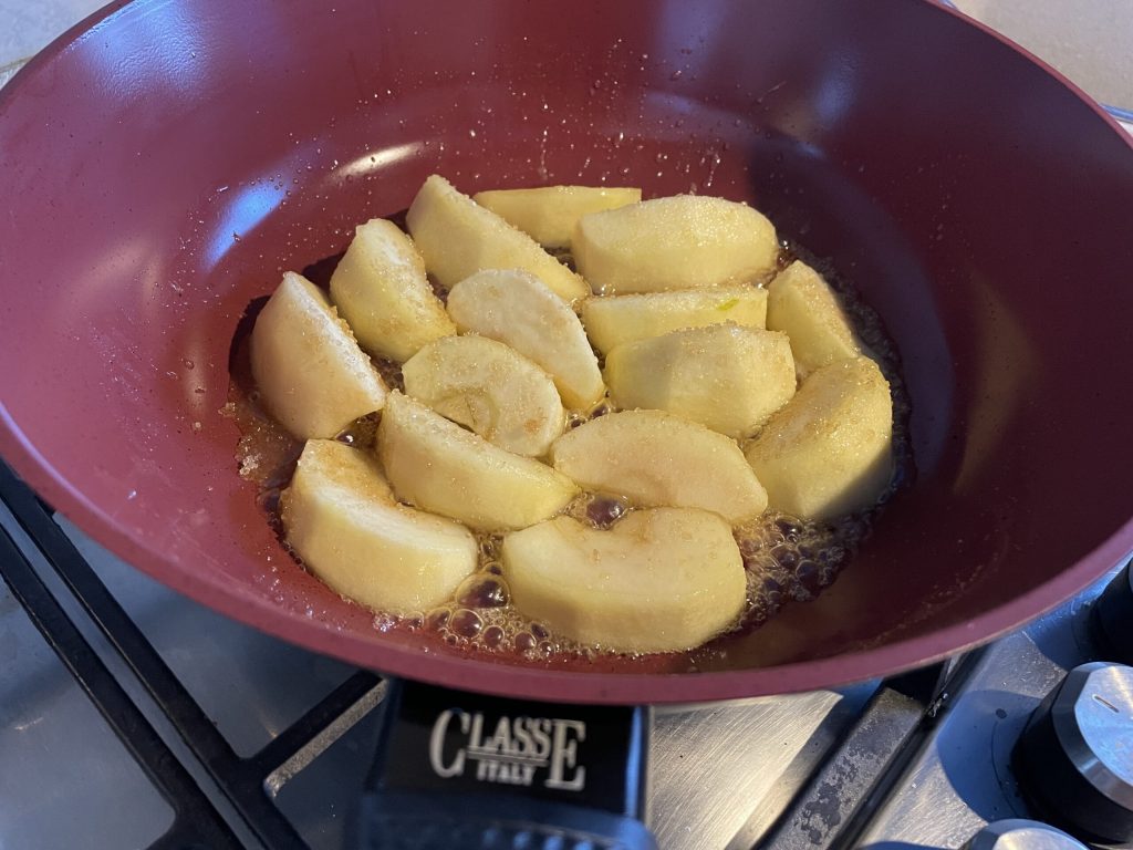Doe de appels in de wok en meng ze voorzichtig om ze over de bodem te verdelen.