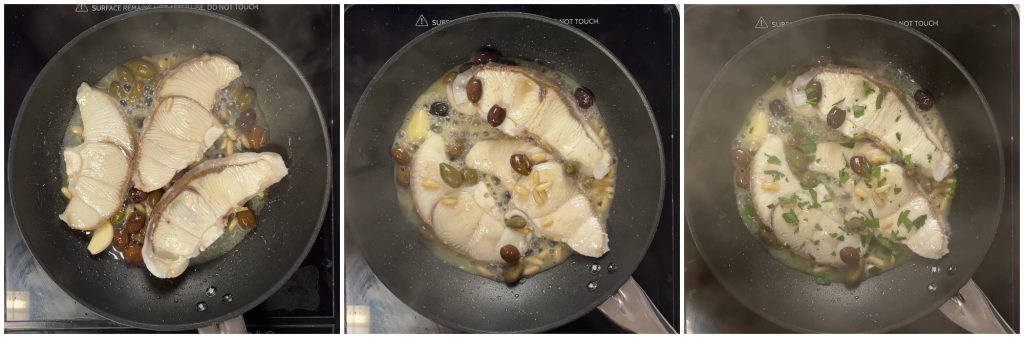Laat de haai plakjes enkele minuten koken, voeg dan de olijven, kappertjes en pijnboompitten toe.