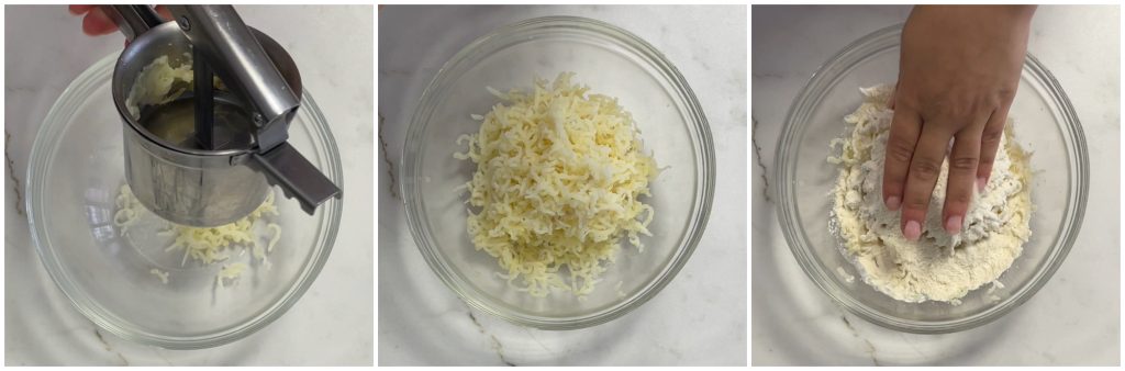 Verzamel de aardappelpuree in een grote kom en voeg de bloem toe.
