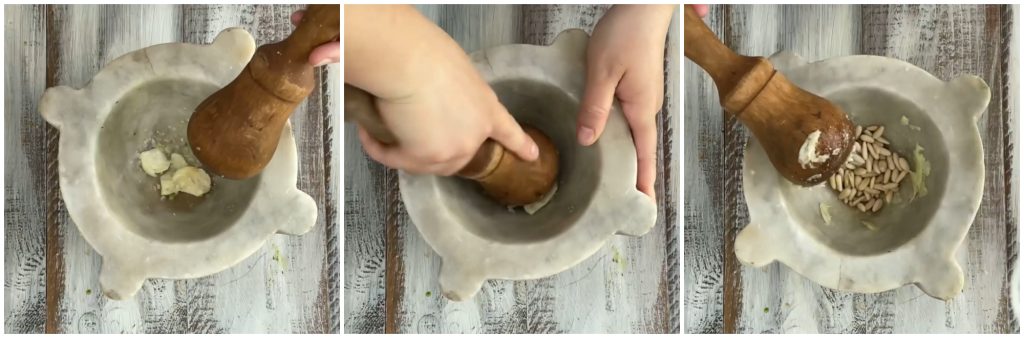 Voeg de pijnboompitten toe aan de gepureerde knoflook en blijf stampen.