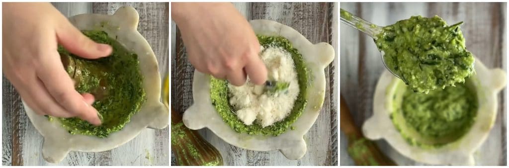 • Voeg de extra vierge olijfolie, de twee geraspte kazen toe en blijf stampen en mengen tot je jouw Genovese pesto verkrijgt.