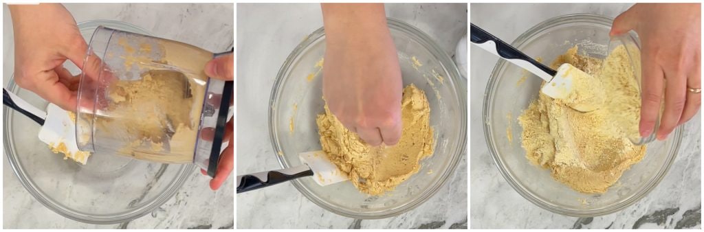 meng het mengsel met de spatel en begin dan met de hand te kneden.
