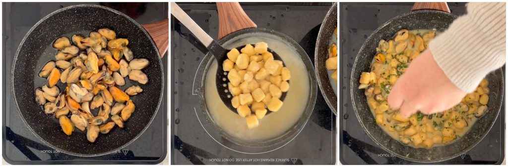 Kook de kikkererwtengnocchi in ruim gezouten water en wanneer ze gaar zijn, laat ze uitlekken en doe ze direct in de pan met de mosselen.