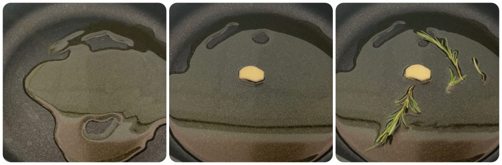 • Verhit de olie in een pan, voeg het teentje knoflook en een paar takjes rozemarijn toe. Laat het opwarmen tot de knoflook en rozemarijn beginnen te sissen.