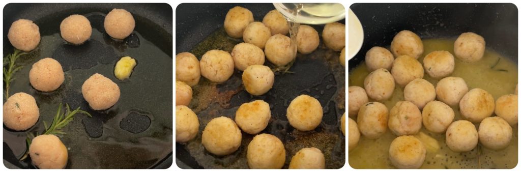 • Leg de kipgehaktballen in de pan, laat ze een paar minuten op hoog vuur bakken, draai ze af en toe om.