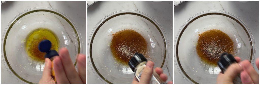 Giet de extra vergine olijfolie in een kom samen met het sap en de geraspte schil van de citroen.