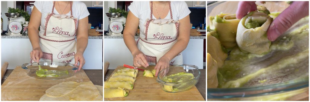 Leg alle lasagne-rolletjes met asperges in de ovenvorm.