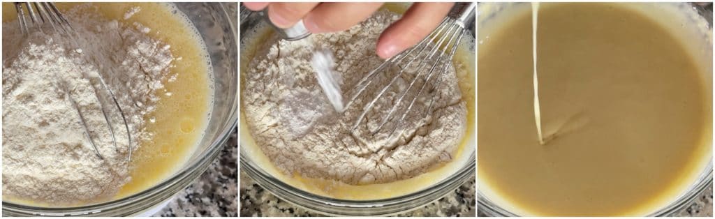 Voeg daarna de gezeefde bloem en bakpoeder toe en blijf mengen, nog steeds met de handgarde, om een glad en klontvrij mengsel te krijgen.