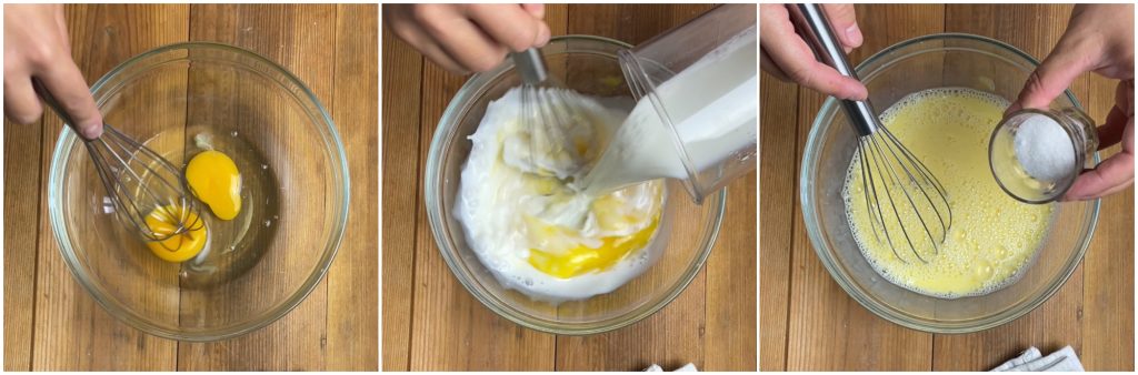Voor het bereiden van de pannenkoeken met appels in het beslag, moet u de eieren in een kom doen, de melk toevoegen en beginnen met kloppen met de handklopper om de twee ingrediënten te mengen.