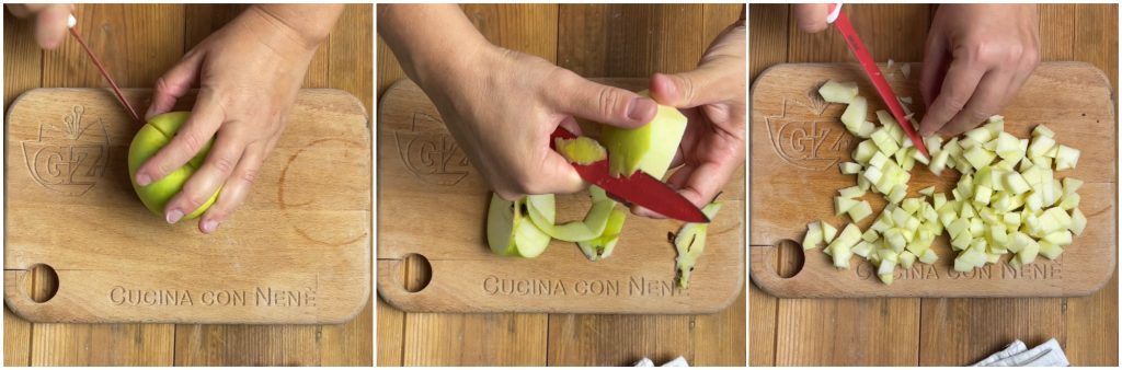 Schil een appel, snijd hem vervolgens in plakjes, dan in reepjes en tenslotte in kleine blokjes en zet apart.