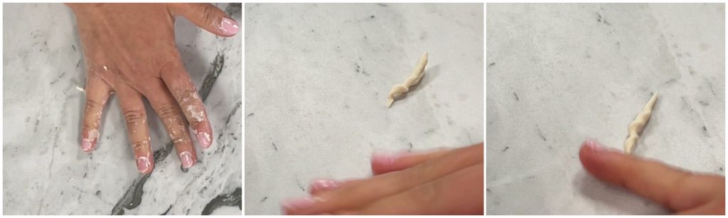 Neem kleine balletjes van het deeg, plaats ze op het werkblad en vorm met je hand de balletjes eerst naar voren en trek ze vervolgens terug door ze voorzichtig met je pink in te drukken. Op deze manier vormt zich de klassieke gedraaide vorm van trofie.
