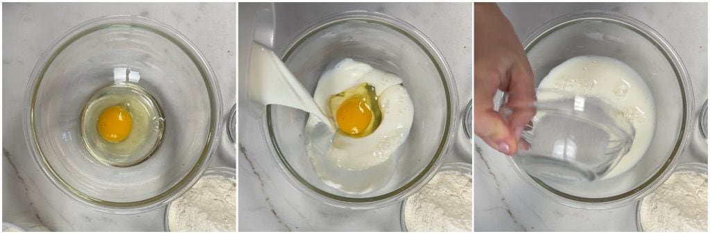 Breek in een kom het volledige ei en voeg de melk en daarna de suiker toe.