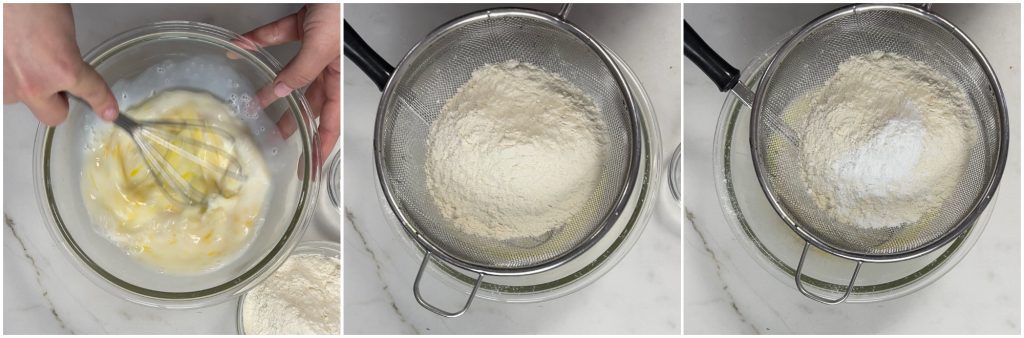 Voeg de bloem en het bakpoeder toe, gezeefd.