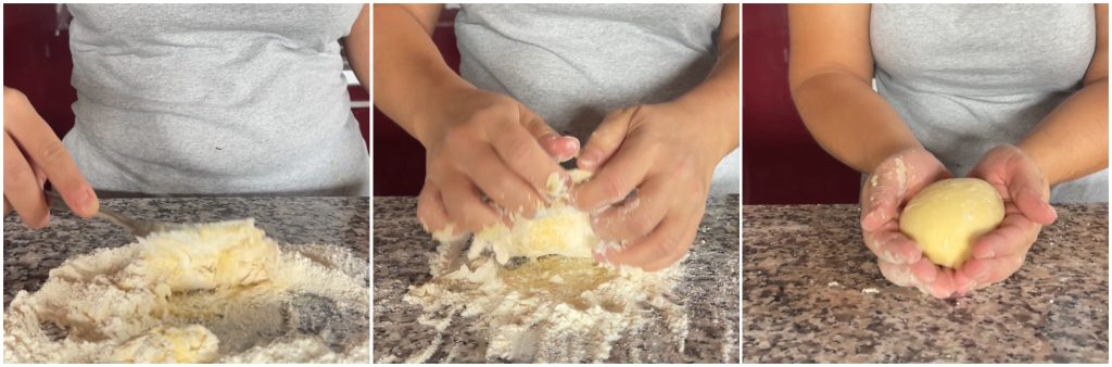 Wanneer het deeg steviger wordt, begin je het met de hand te kneden, steeds krachtiger, tot je een glad en homogeen deeg krijgt.
