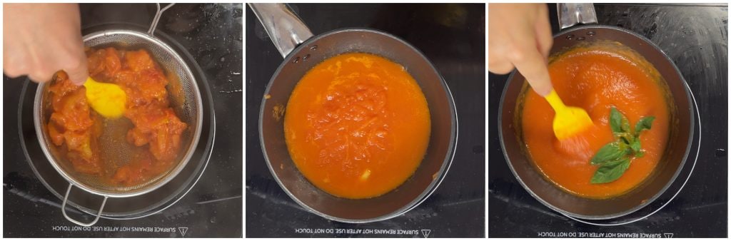 Als de tomaten gaar zijn, verwarm je een scheutje olie in een tweede pannetje. Voeg een gepeld en geplet teentje knoflook toe en laat het op hoog vuur smaken. Giet vervolgens het tomatenmengsel in de passe-vite of een fijne zeef en haal het erdoor om een gladde en homogene puree te verkrijgen.
