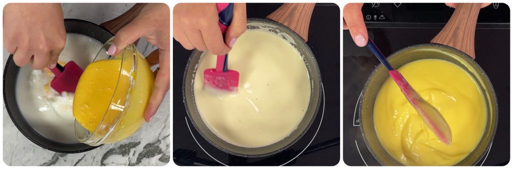 Verwarm de melk in een steelpan, en voeg het eimengsel toe als het warm is.