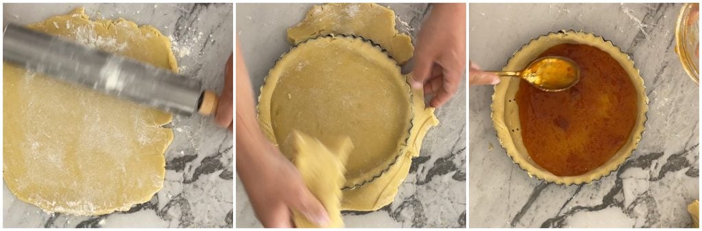 Beboter en bebloem een vorm van 24 cm in diameter en leg het zanddeeg op de bodem van de vorm.