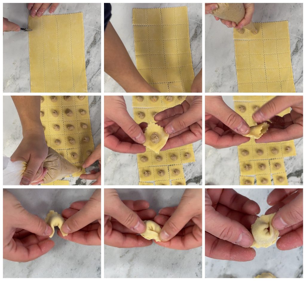 Leg een beetje vulling op elk vierkantje en vouw het dan eerst dubbel en vervolgens de twee uiteinden samen om je cappelletto te vormen.