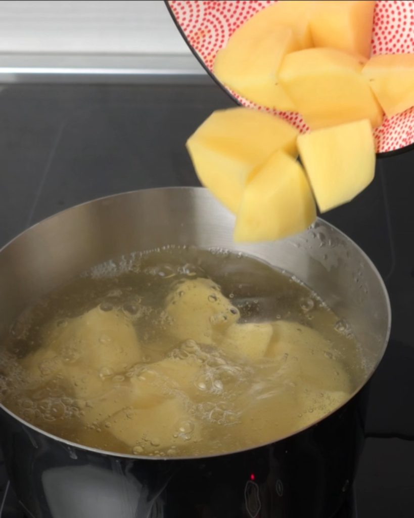 Schil de aardappelen en snijd ze in min of meer gelijke stukken en kook ze in gezouten kokend water gedurende ongeveer 7-8 minuten of totdat ze zacht zijn met een vork.