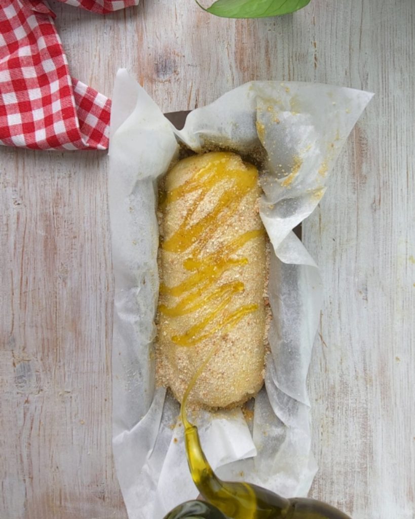 Bestrooi het oppervlak met paneermeel en een scheutje olie. Bak het aardappelgehaktbrood in een voorverwarmde oven op 200°C gedurende ongeveer 35-40 minuten.